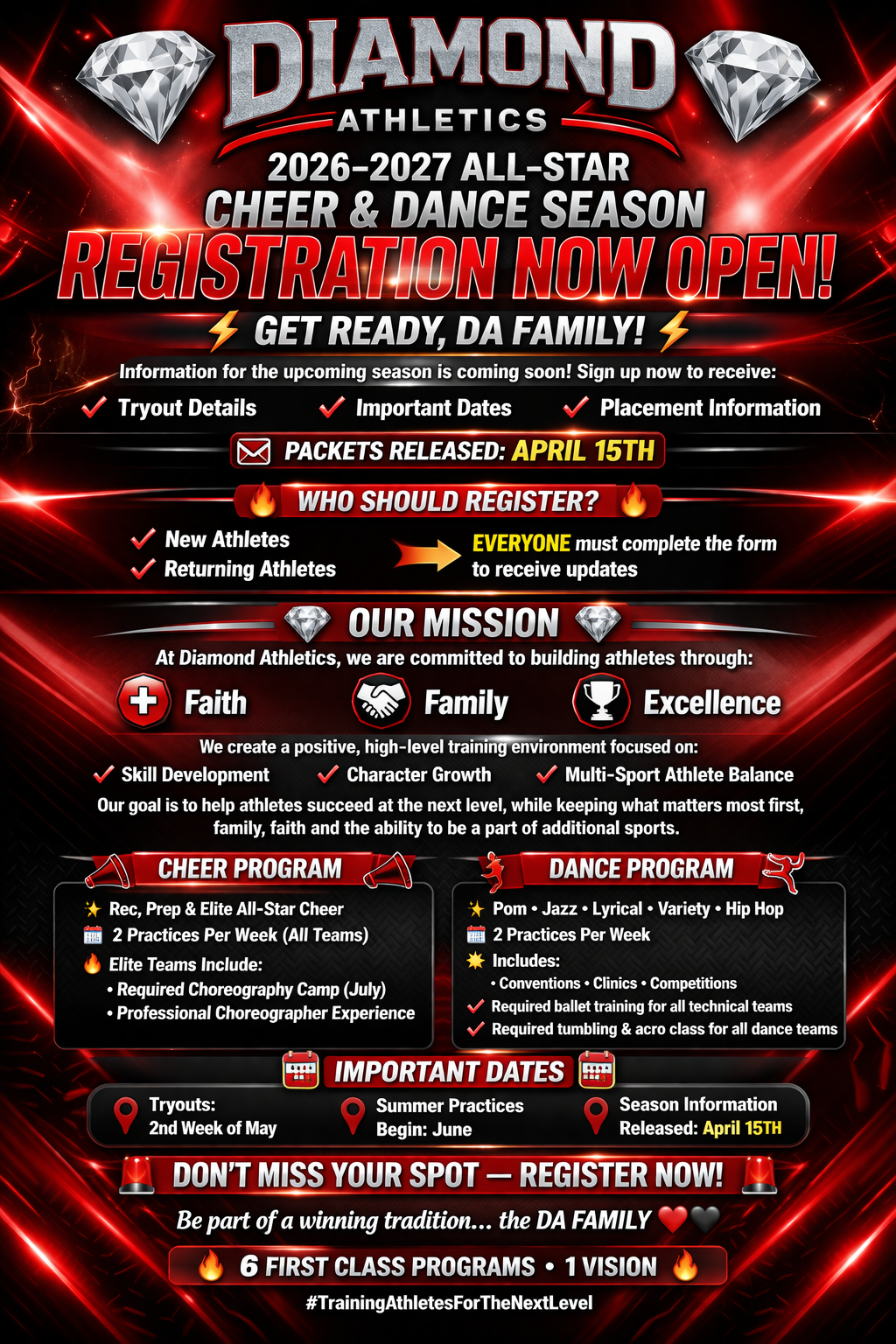 Diamond Athletics Dance, Tumbling, and Cheer is committed to creating a positive and inspiring environment where every individual has the opportunity to learn and grow. Our goal is to help each student build self-esteem, confidence, coordination, musicality, and strong technical skills. At DA Dance & Cheer, we pride ourselves on delivering high-quality, expert instruction in an encouraging, Christ-centered approach, providing a dynamic and enriching gym experience.